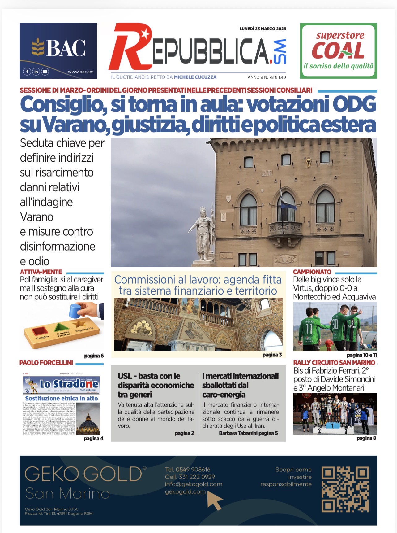 La prima pagina de La Repubblica SM dedica spazio alla visita ufficiale della Presidente della Commissione Esteri e Difesa della Repubblica Italiana, Stefania Craxi, in arrivo a San Marino per colloqui istituzionali.