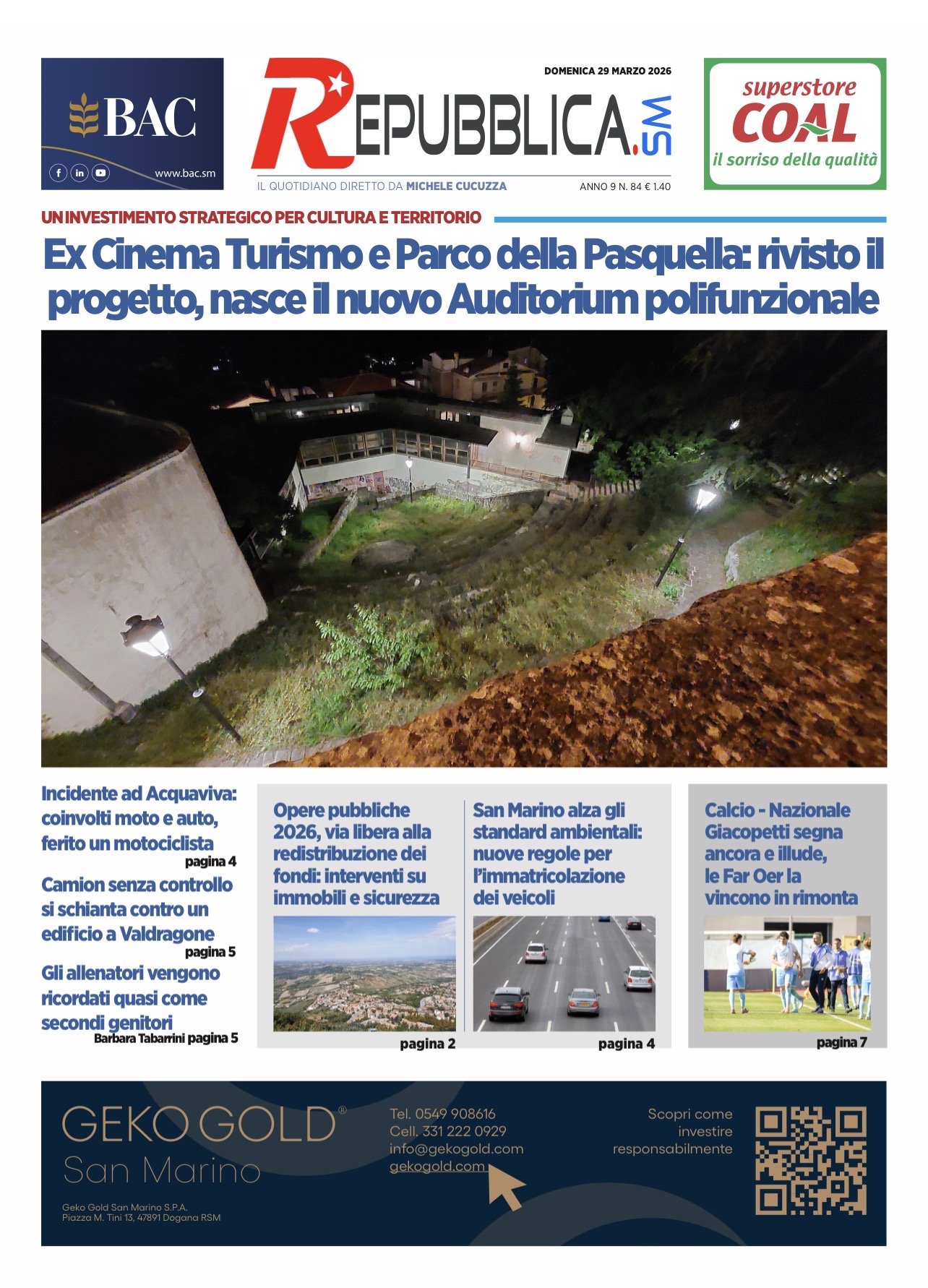 La prima pagina de La Repubblica SM del 29 marzo 2026 offre uno sguardo completo sull’attualità sammarinese.
